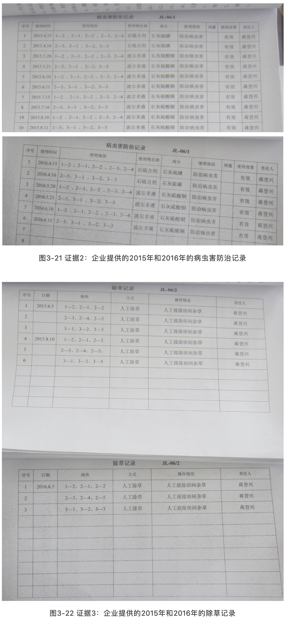 專項監(jiān)督現(xiàn)場檢查中企業(yè)僅能提供2015年和2016年的農(nóng)事記錄,但其提供這兩年的農(nóng)事記錄(包括肥料施用記錄、病蟲害防治記錄、除草記錄)除年份不同外,其操作時間、操作內容、操作人等完全一致,明顯為編造的記錄(證據(jù)1、證據(jù)2、證據(jù)3見圖3-20,圖3-21,圖3-22);企業(yè)提供的投入品購買單據(jù)為連號收據(jù),而購買時間分別為2015年3月25日(票據(jù)編號為7975418)和2015年6月25日(票據(jù)編號7975417),購買時間的前后順序與收據(jù)號碼的順序無法對應,購買收據(jù)不具備可信性和真實性。(證據(jù)4見圖3-23)。